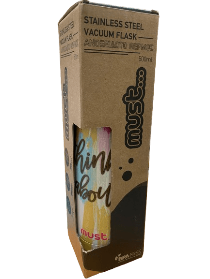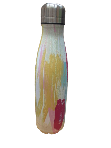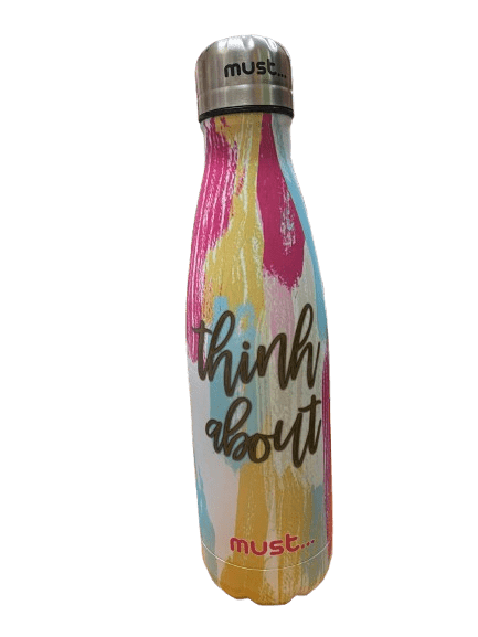 El diseño del termo es llamativo y artístico, con un estampado de colores vivos que combina tonos pastel como rosa, amarillo y azul. El mensaje «Think About» en una tipografía cursiva le agrega un toque motivacional y personal, perfecto para llevar a cualquier lugar. La apariencia es fresca y juvenil, ideal para personas que buscan destacar incluso en los pequeños detalles.
