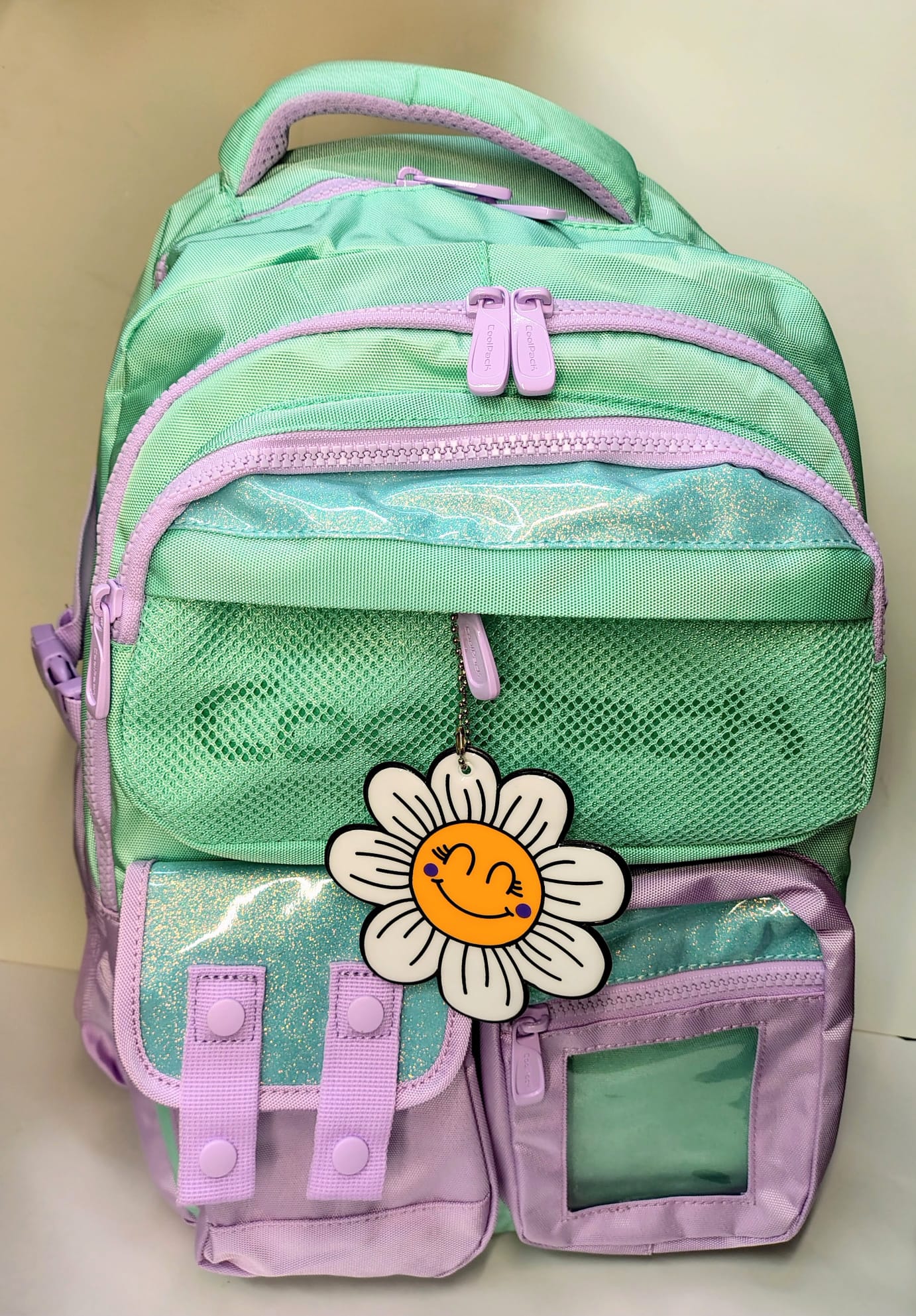 Mochila morada y verde menta, ideal para llevar de viaje.