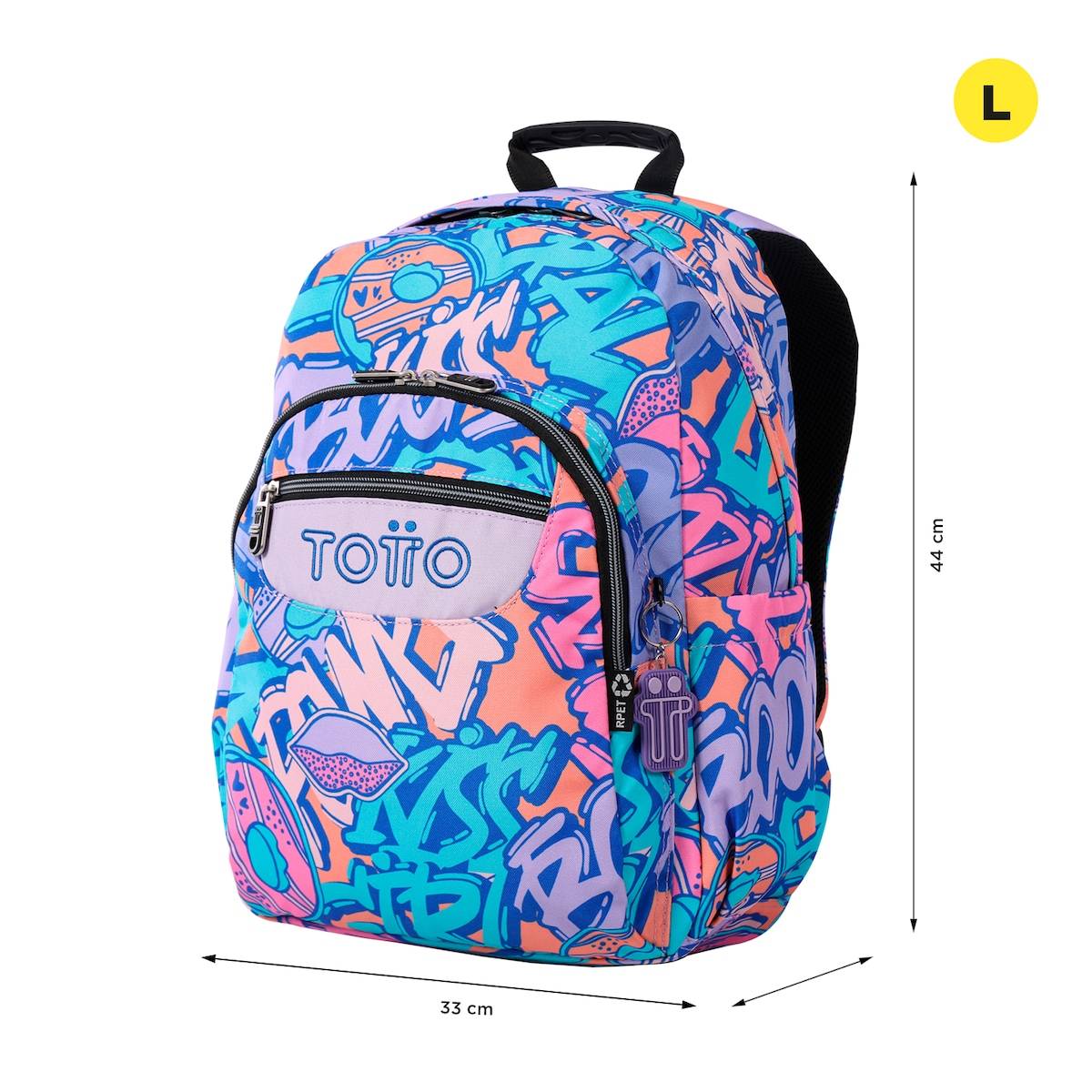 Mochila Totto Acuareles escolar eco-friendly color Broad, se adapta a carro, pudiendo llevarse como mochila de espalda o con ruedas indistintamente. Tiene unas dimensiones de 33 x 44 x 14 cm.
