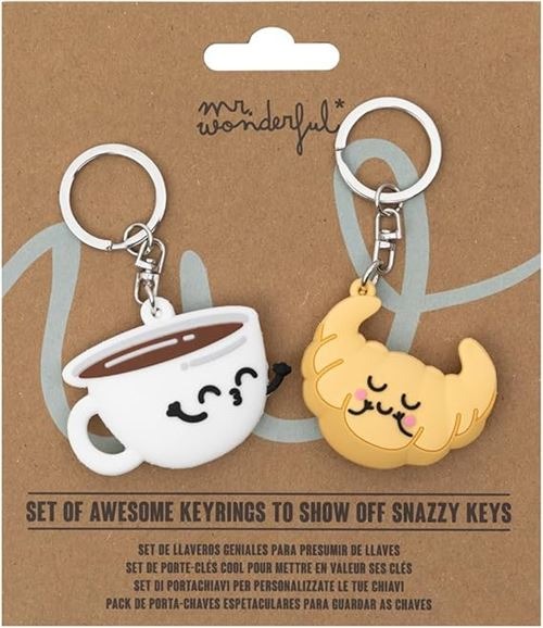 Set de dos llaveros de caucho: uno con forma de taza de café y otro de croissant. Perfectos para amantes de la buena mesa.