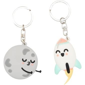 Set de dos llaveros de caucho: uno con forma de cohete y otro de luna. Un detalle original perfecto para regalar.